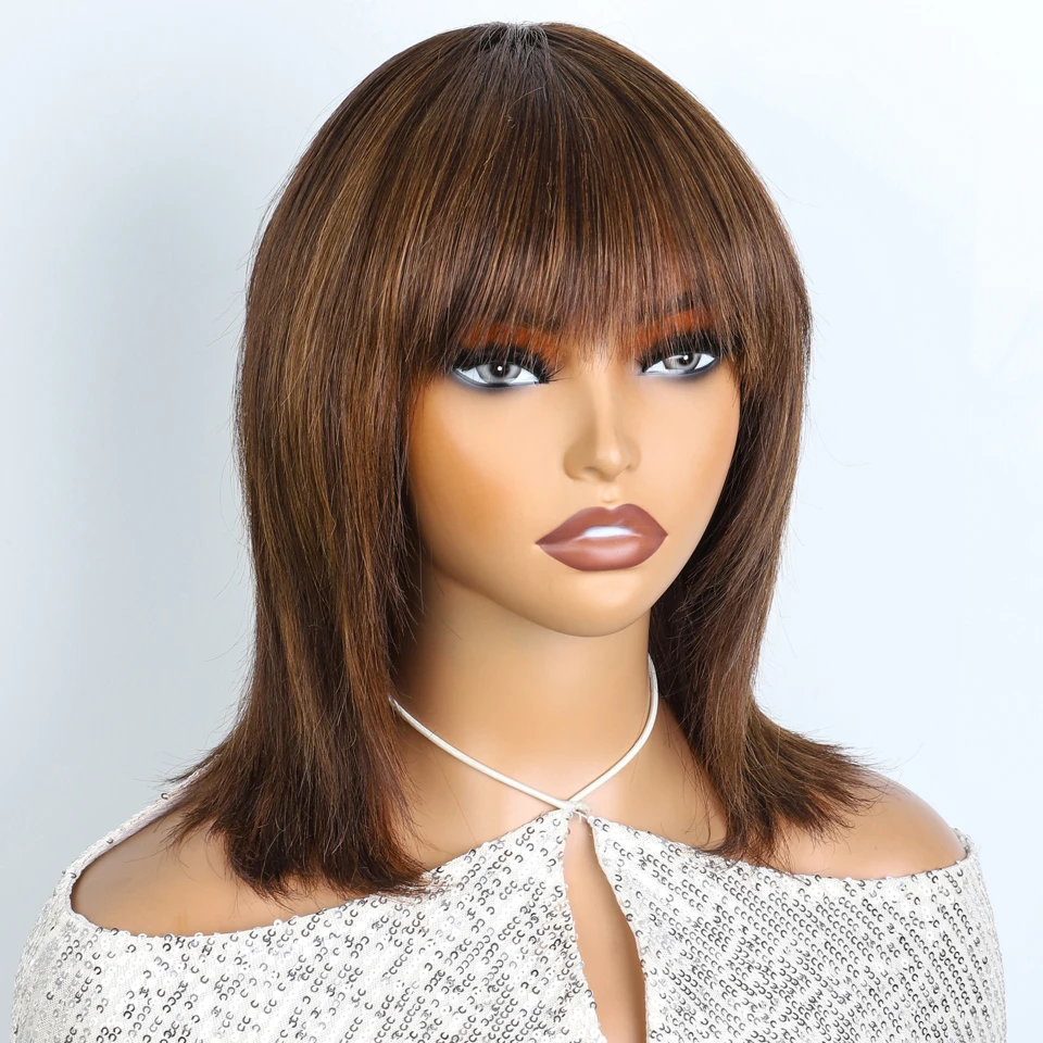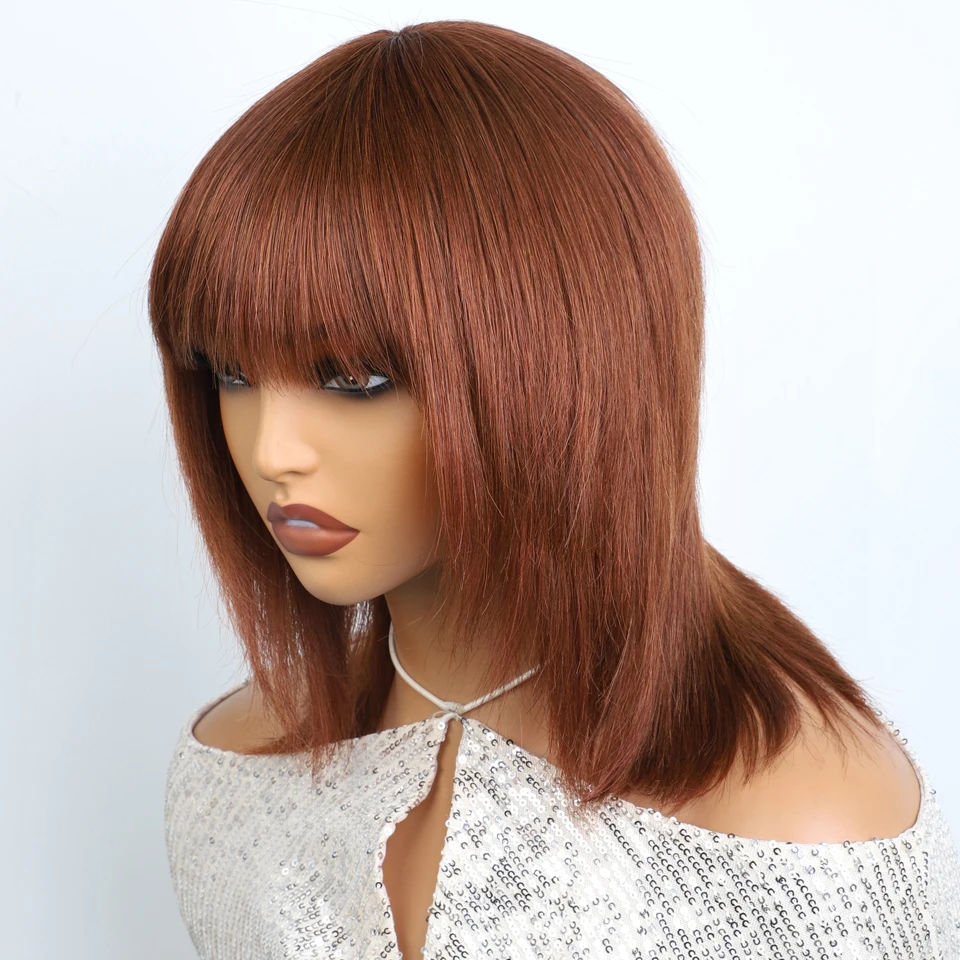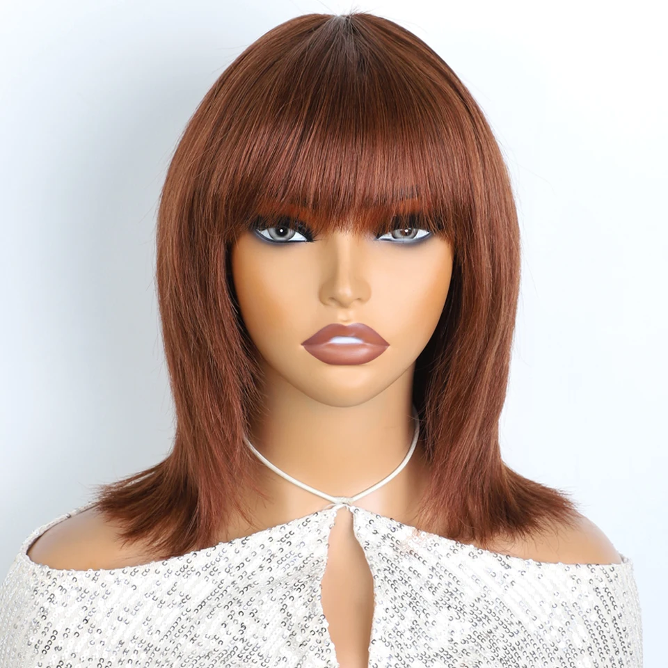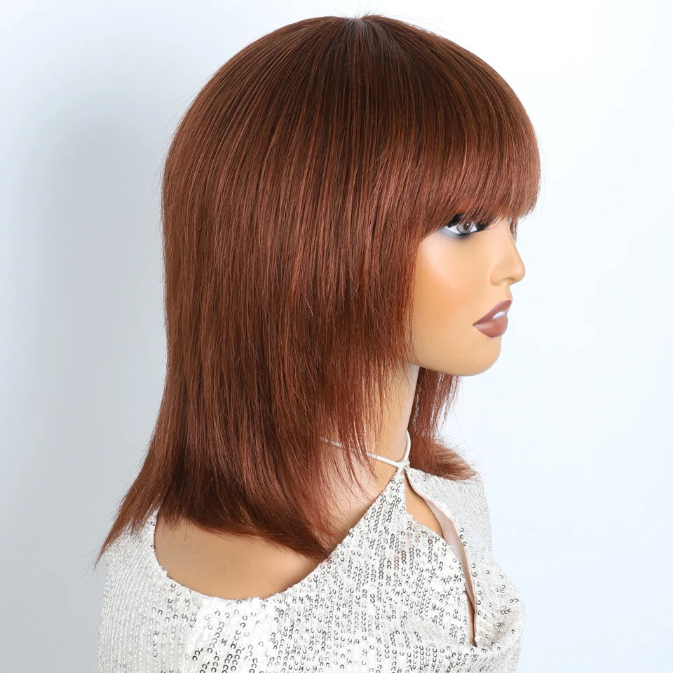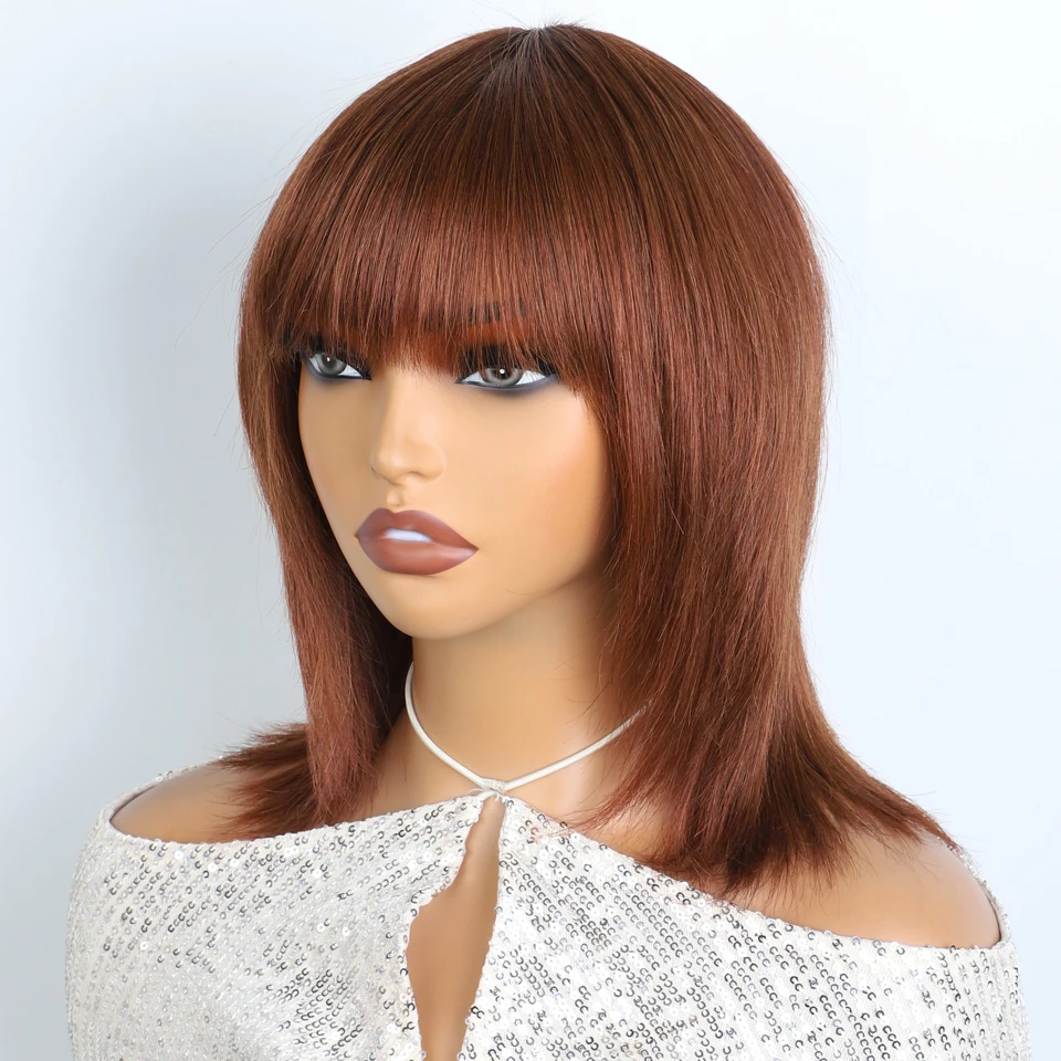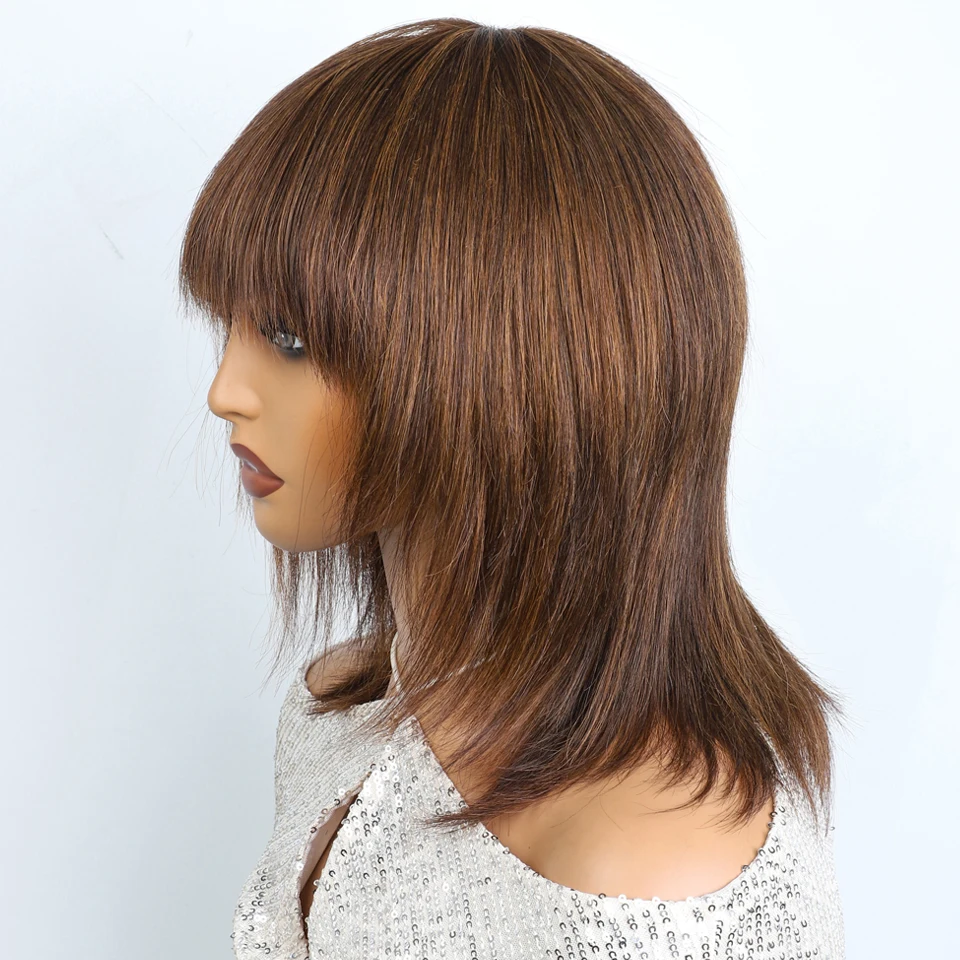 Lekker Glueless Short Brown Wolf Cut Straight Bob Human Hair Wigs With Bangs For Women Brazilian Remy Hair Ready to Wear Bob Wig