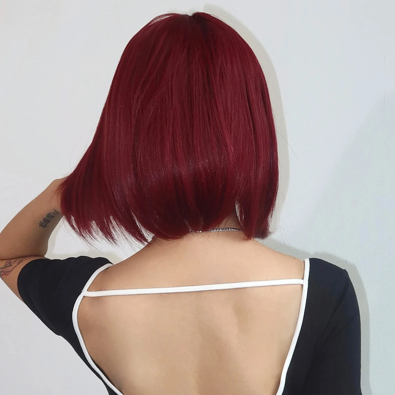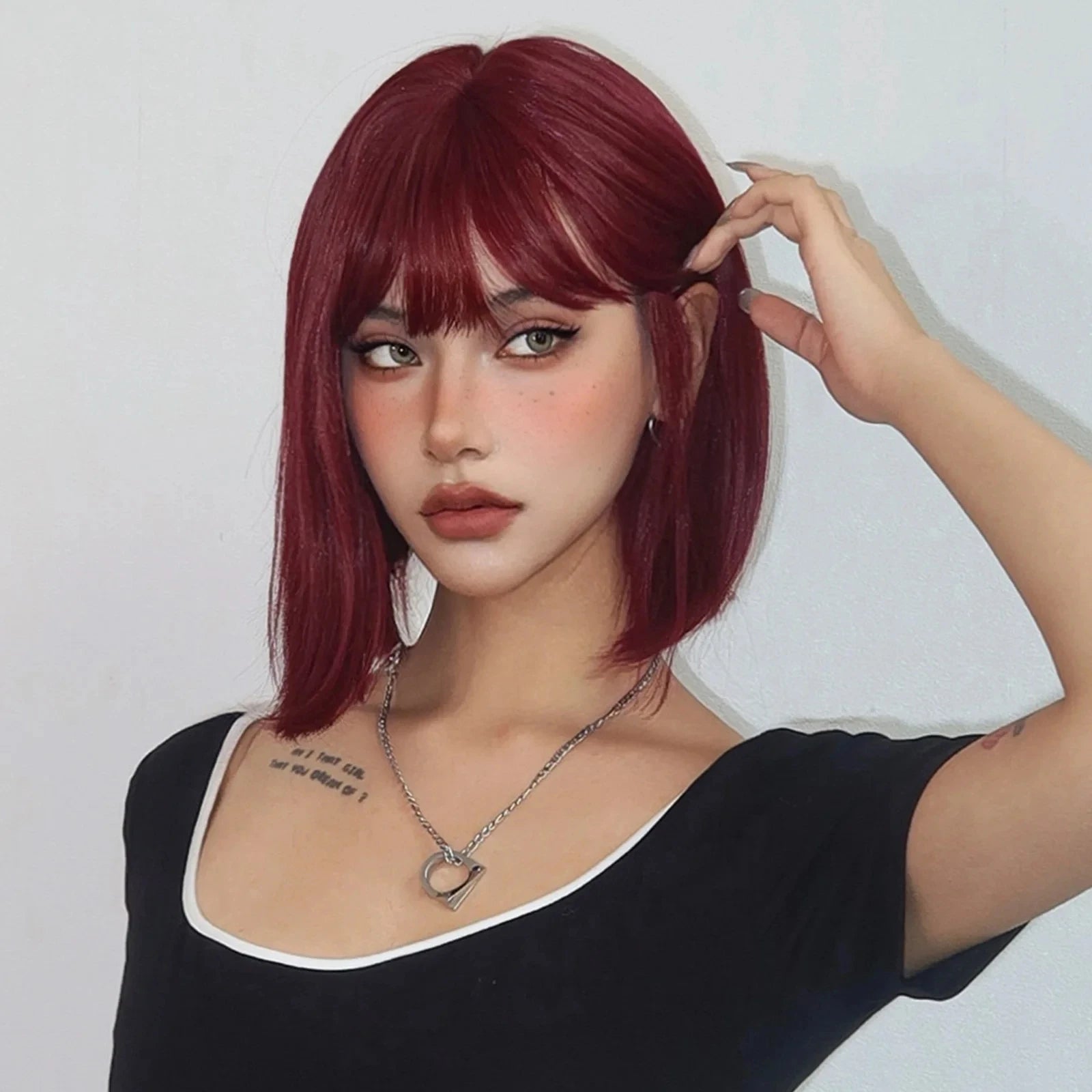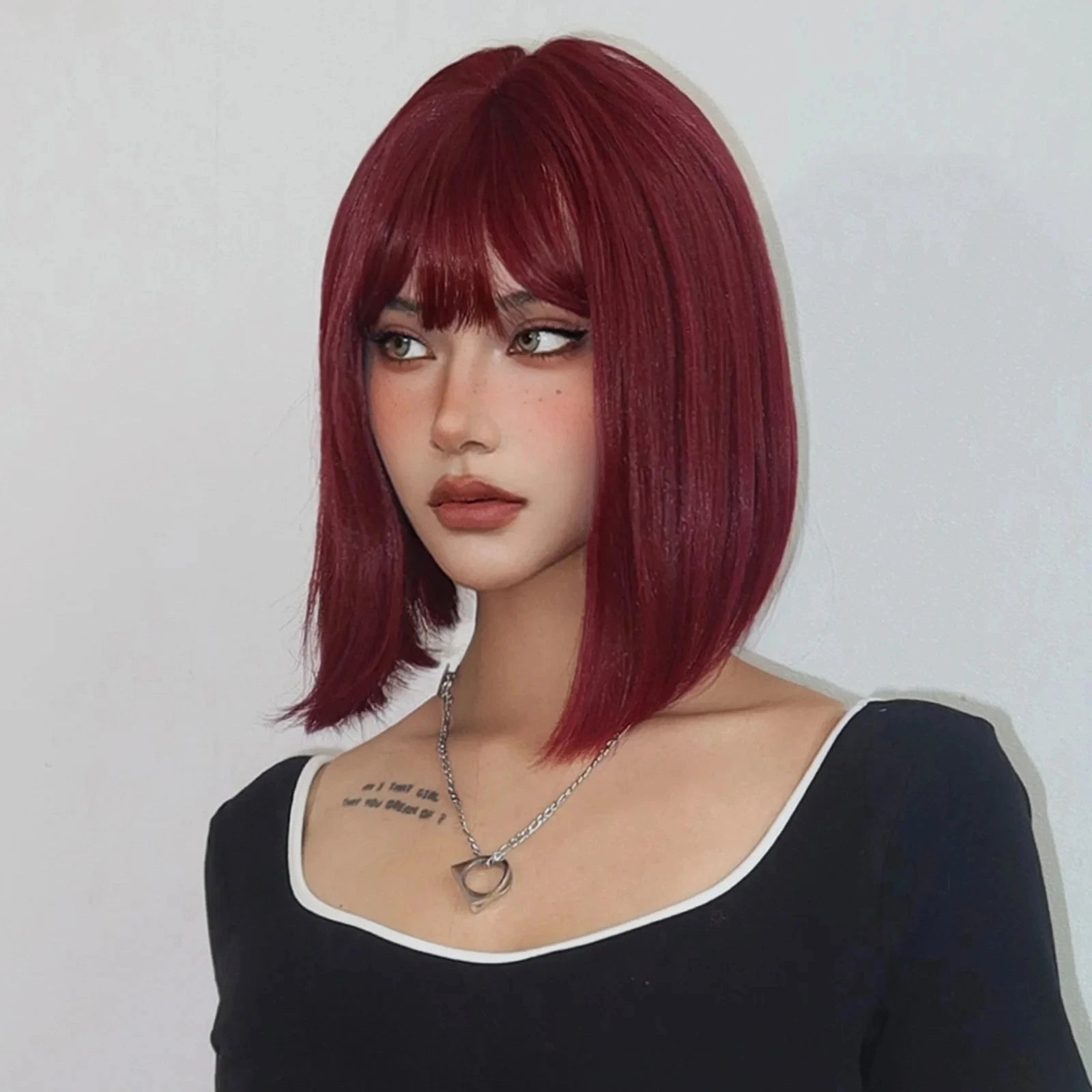 Short bob hairstyle, wine red synthetic wig, Halloween party cosplay wig, daily high-temperature hair accessory wig set