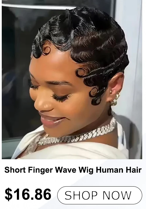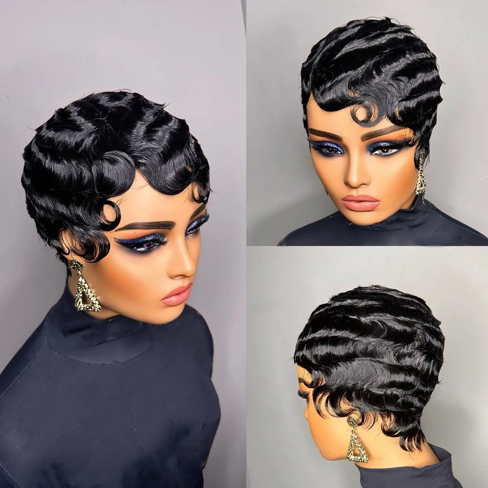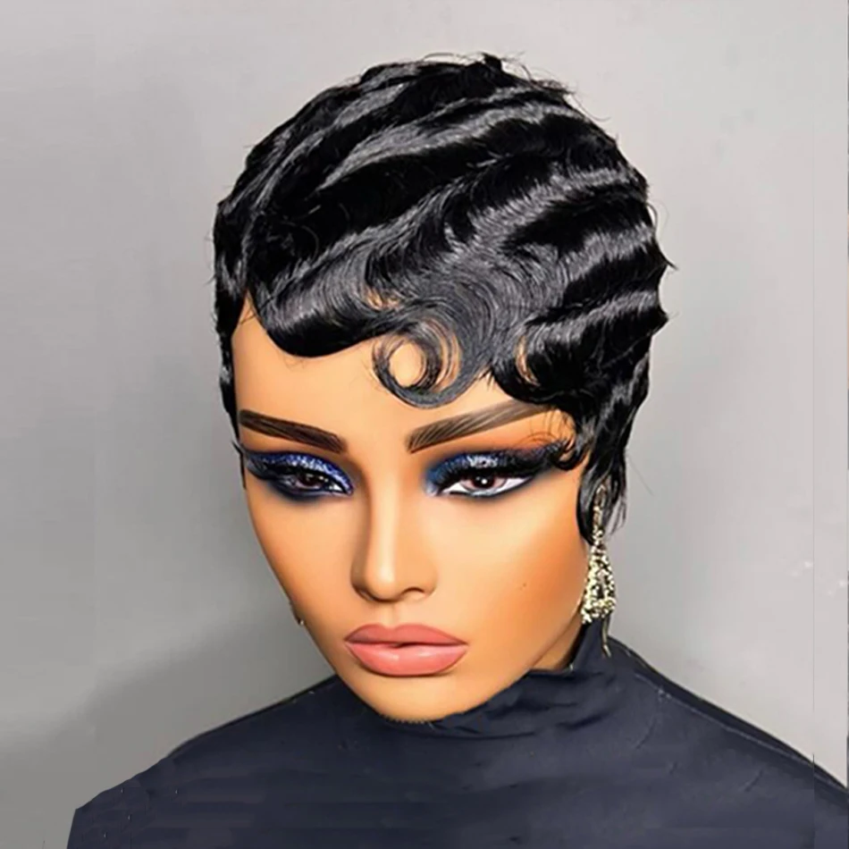 Short Finger Wave Wig for Women Black Pixie Cut Wigs Glueless 100% Human Hair Mommy Wigs Pixie Short Layered Ocean Waves Wig