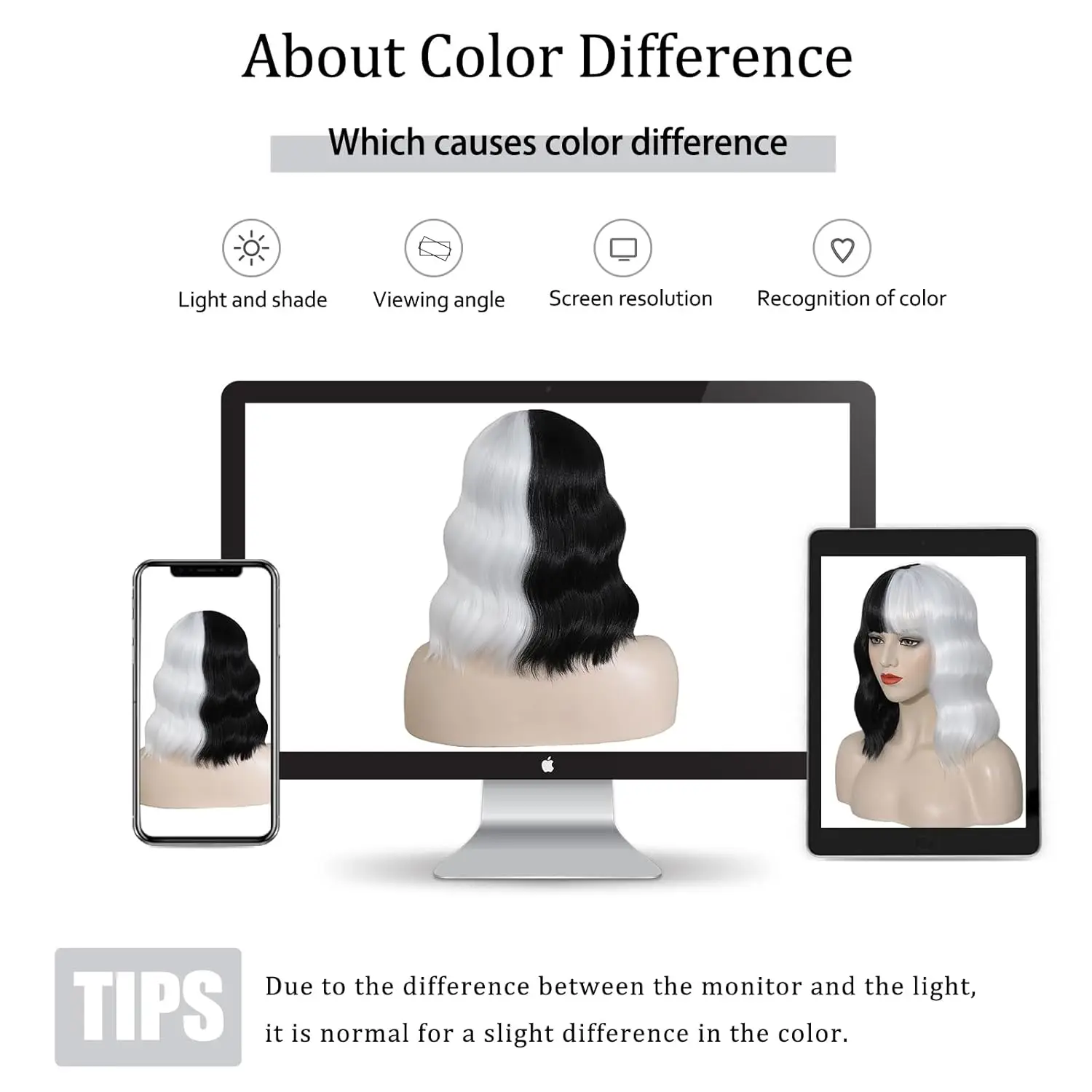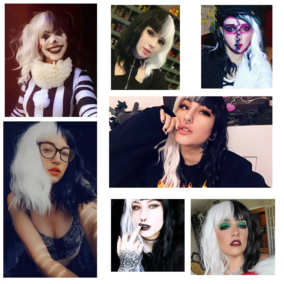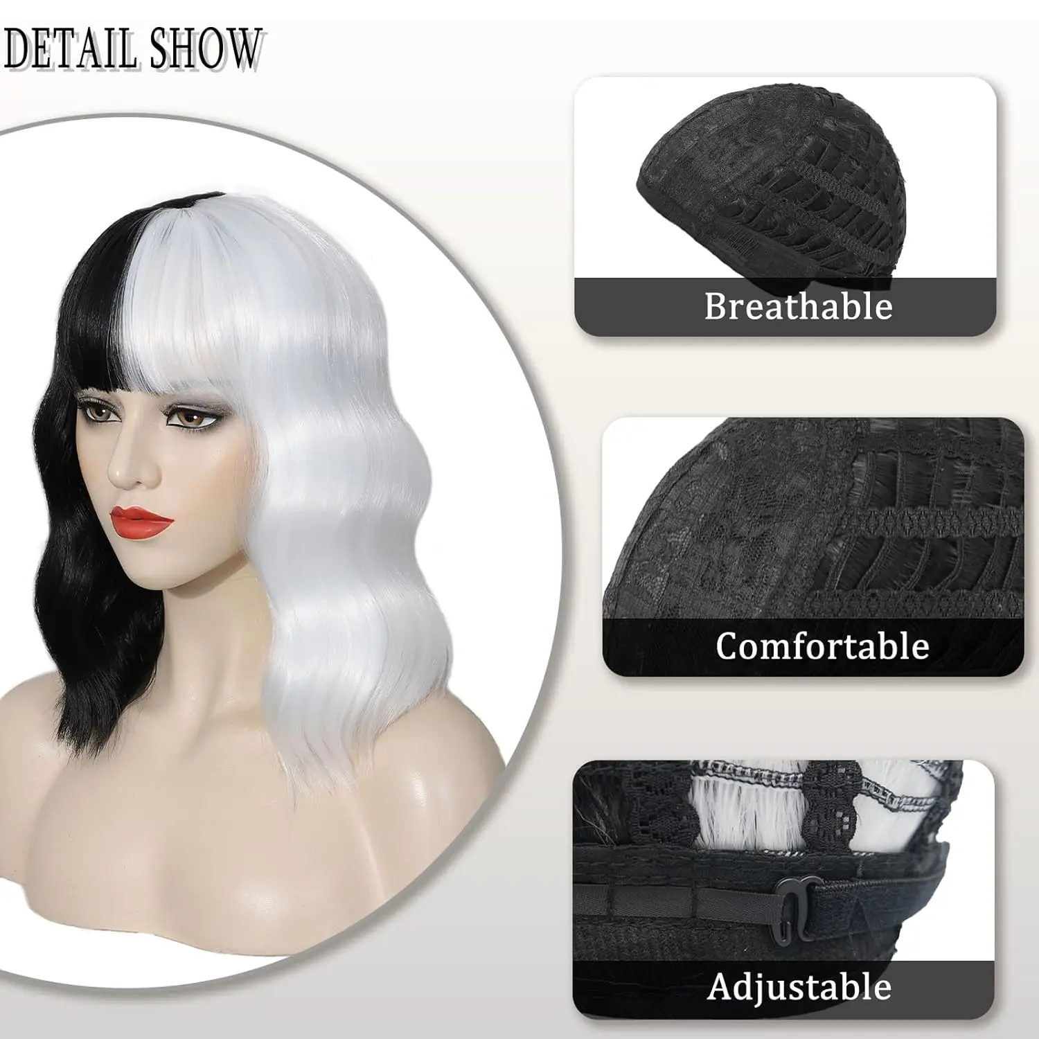 Synthetic Black and White Wigs for Women Costume Short Bob Wavy Curly Wigs Heat Resistant Wigs for Party Cosplay Halloween
