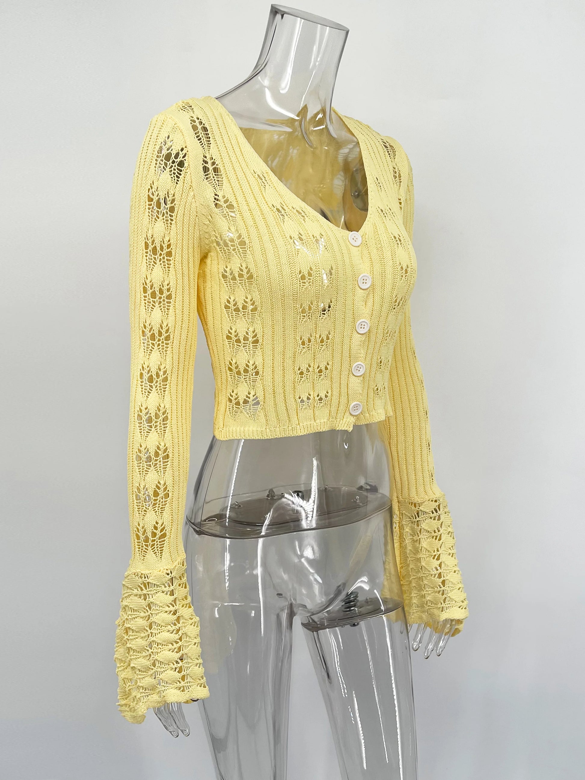 Tossy Knitwear Hollow Out Sweater Cardigan Women V-Neck Long Sleeve See-Through Cropped Top Summer Knit Patchwork Cardigan Top